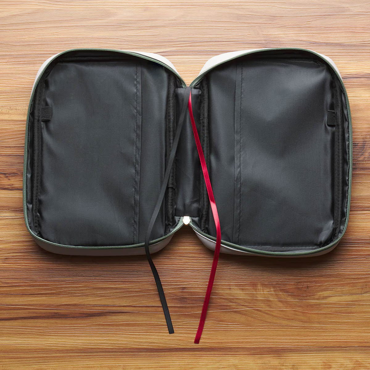 Inside, you'll find a spacious compartment that holds your Bible securely, along with two elastic pen loops to keep your favorite writing tools always within reach. The cover is securely closed with a cactus green zipper and a second rose gold cross-engraved metal zipper pull.