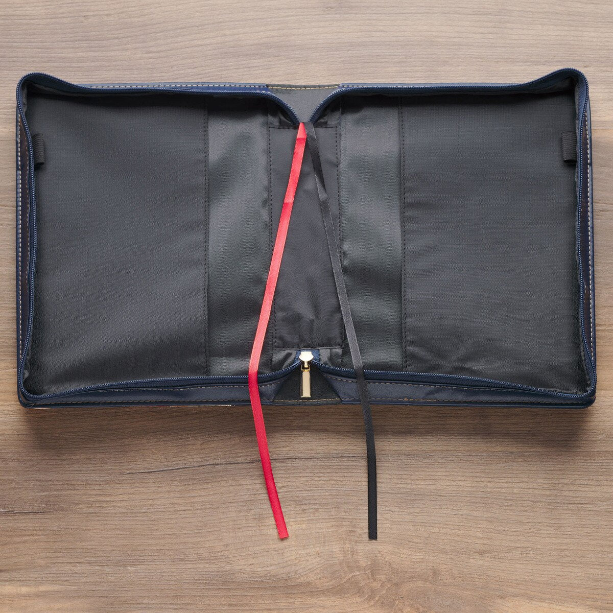 Sturdy blue topstitching ensures that all edges and seams are reinforced to produce a durable case that will protect your Bible from wear and tear. To keep its contents safe, the case has a smooth-gliding blue zipper that sports a gold metal zipper pull.