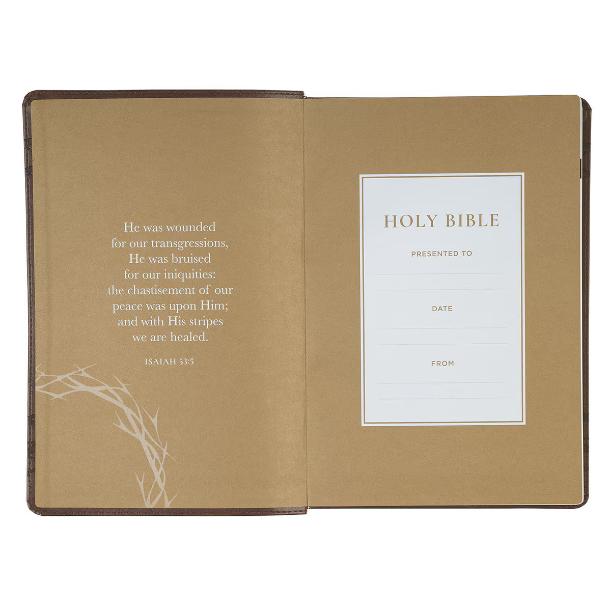 Let the powerful visual reminder of Christ's sacrifice draw you deeper into God's Word with the Brown Crown of Thorns Giant Print Full-size King James Version Bible with Thumb Index. This Bible, with its piercing design, will help you study, reflect, and grow in your faith.