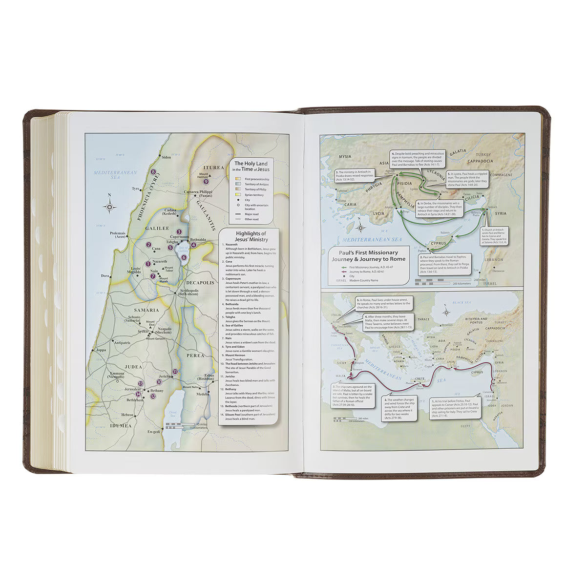 This Bible includes reinforced stitching, rounded corners, and a Smyth-sewn binding that allows it to lie flat when open. The elegantly gilt-edged pages offer extra protection from wear and moisture. Navigation is easy with black thumb indexing tabs and a coordinating brown satin ribbon marker.