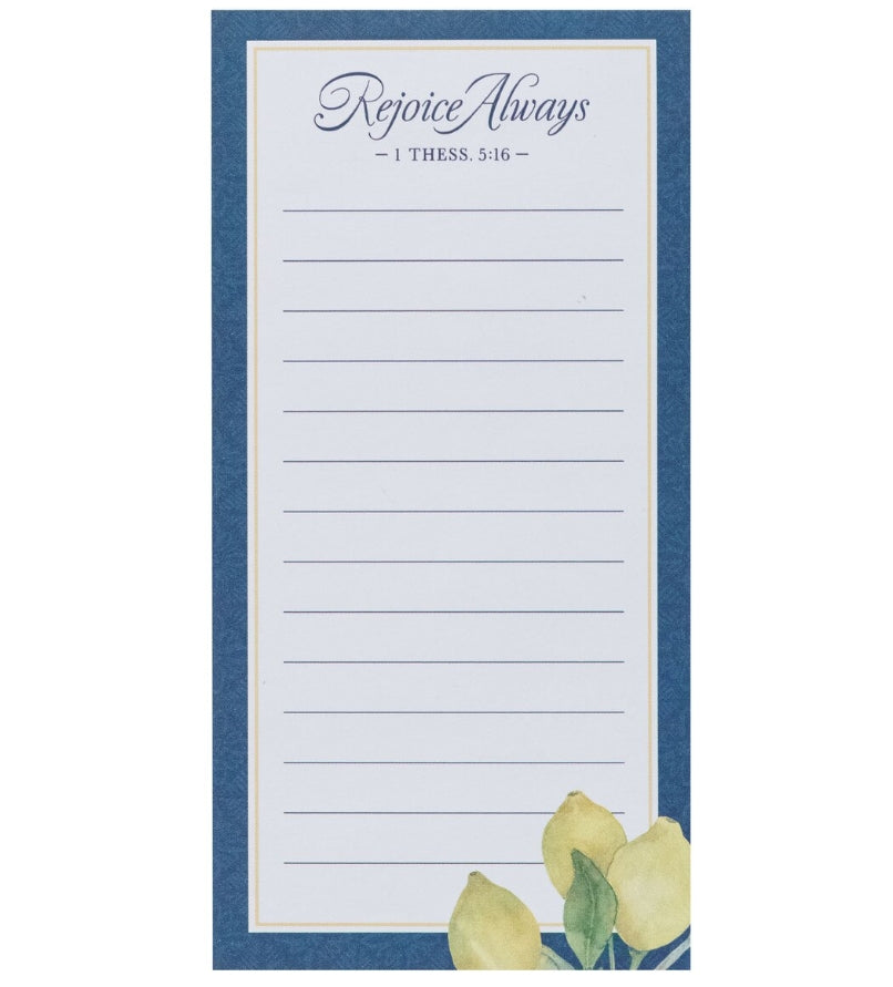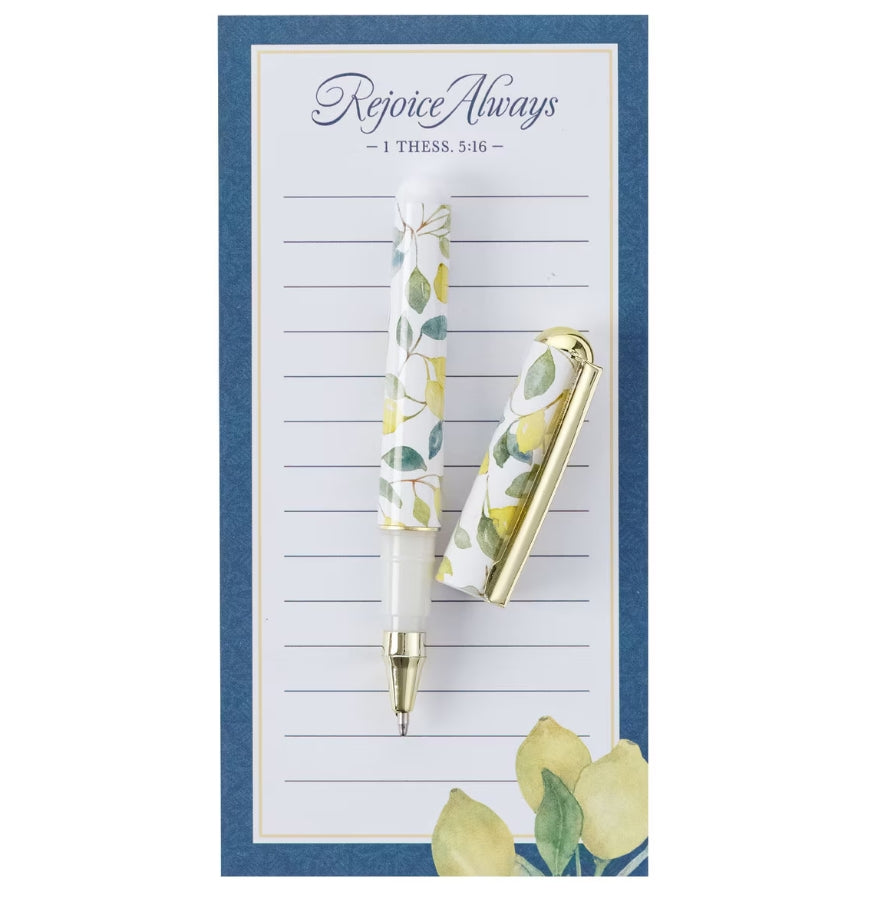 Keep a cheerful reminder to choose joy close at hand when you create lists on the Rejoice Always Lemon Magnetic Notepad with Pen Set.