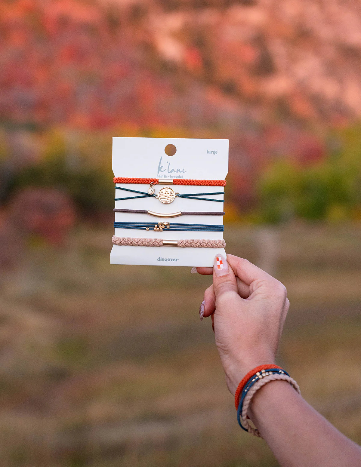 Our DISCOVER set includes five hair tie bracelets in bold jewel tones of orange, green, blue, and brown. The majestic pine trees on the gold charm will remind us to reach our full potential.
