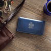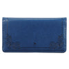 - Navy blue checkbook cover with debossed rose motif