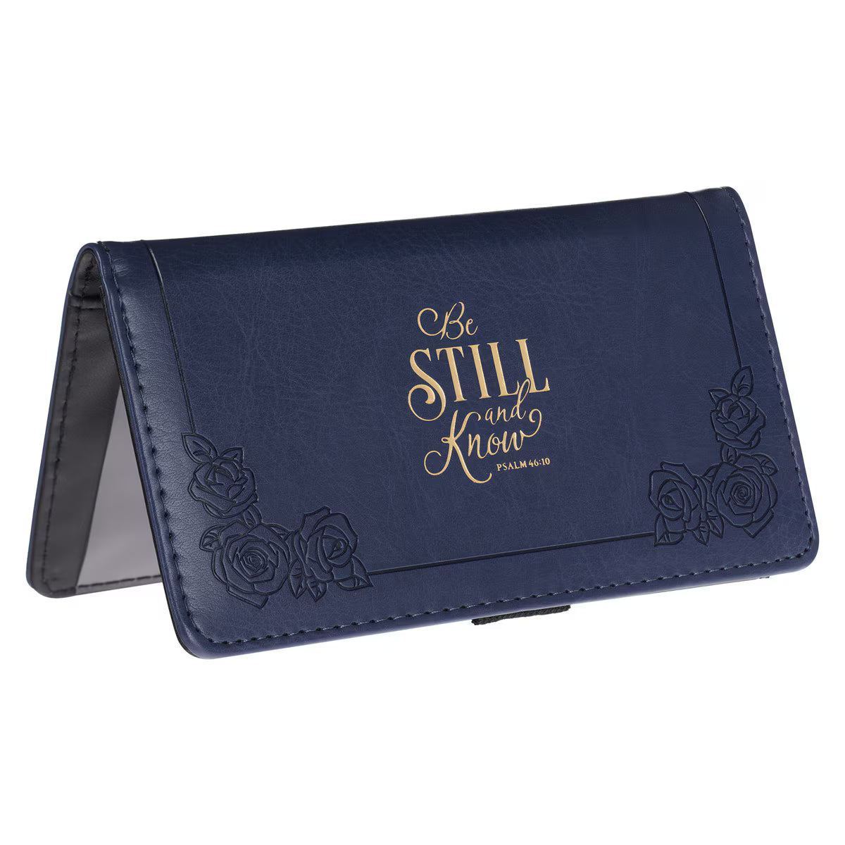 Remind yourself of your reliance on the LORD each time you reach for your checkbook nestled inside the Be Still & Know Navy Faux Leather Checkbook Cover.