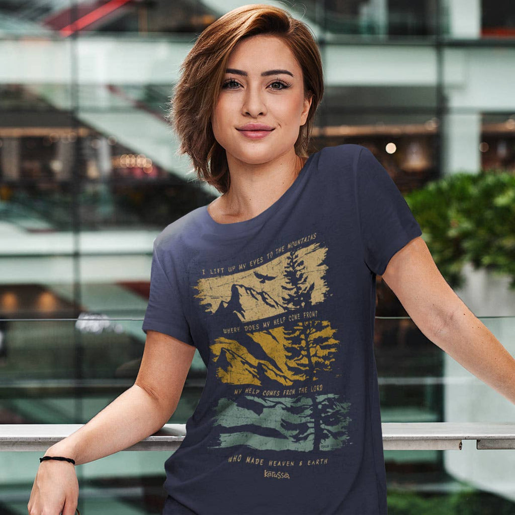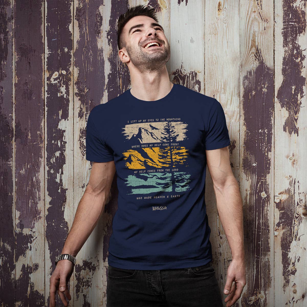 Lift My Eyes Up™ Lift your eyes to the mountains in this memorable “Lift My Eyes Up” T-shirt by Kerusso® in Navy. Our help comes from the Lord, the very maker of the stars above. We can trust Him to make a way through our personal challenges. You are not alone. Jesus loves you, and when you are struggling, He wants to help. Seek out Christian community, read the Bible, and rest in the knowledge that God is ready and willing to help when you need it. This classic T-shirt is a thoughtful way to share the Good News about Jesus. Kerusso® Adult T-Shirt - Lift My Eyes Up™ - Color: Navy - 100% Cotton, 5.3 oz. - Standard Fit - Taped neck and shoulders - Double-needle stitching at sleeve and bottom hem