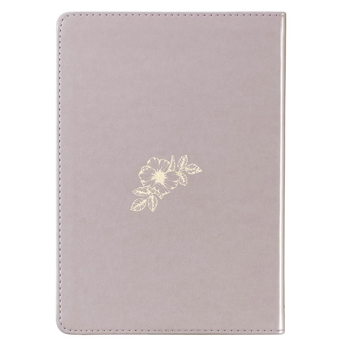 The taupe cover of the journal is made of smooth faux leather and displays a lovely heat-debossed floral design that stretches across the front cover and crowns the gold-foiled sentiment and heat-debossed Scripture reference,