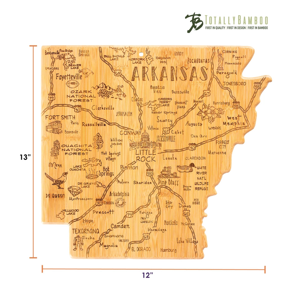 Totally Bamboo's most popular line! The Destination Series captures the spirit of each state with fun laser-engraved artwork of the towns, places and sights throughout the state. Each of the cutting boards in the series is cut to the unique shape of its state— and every state is available! Shoppers love using them as conversation-starting charcuterie boards. Every slice of cheese removed reveals more of the map and another place to discuss and reminisce about. The blank reverse side offers all the benefits of a bamboo cutting board; it's durable and gentle on knives. Each cheese board also includes a hang tie to easily double as well décor. Whether purchased as a gift or for their own home, your shoppers will love seeing their state's Destination in your store! Destination Arkansas cutting board measures 13" x 12" x 5/8"