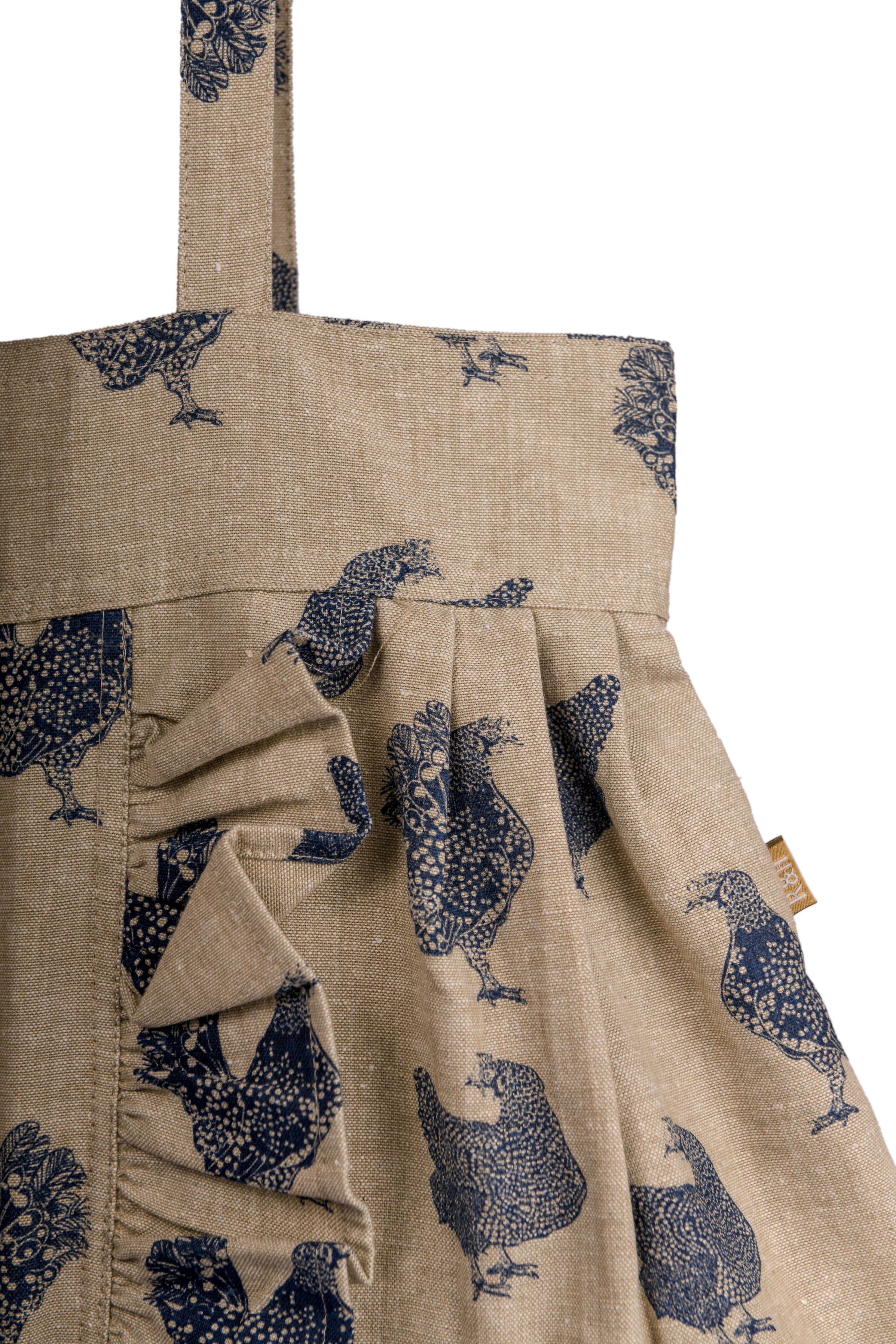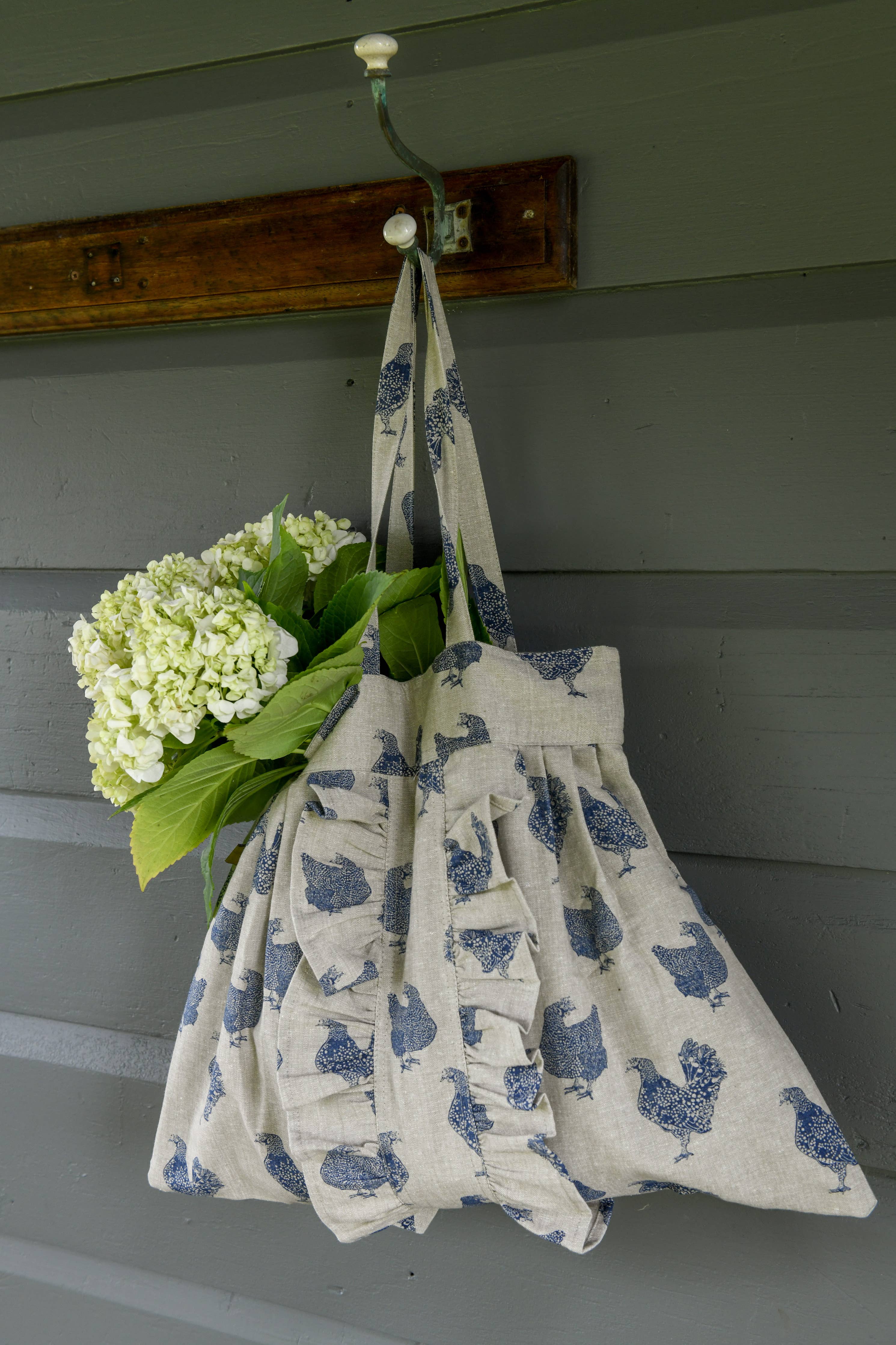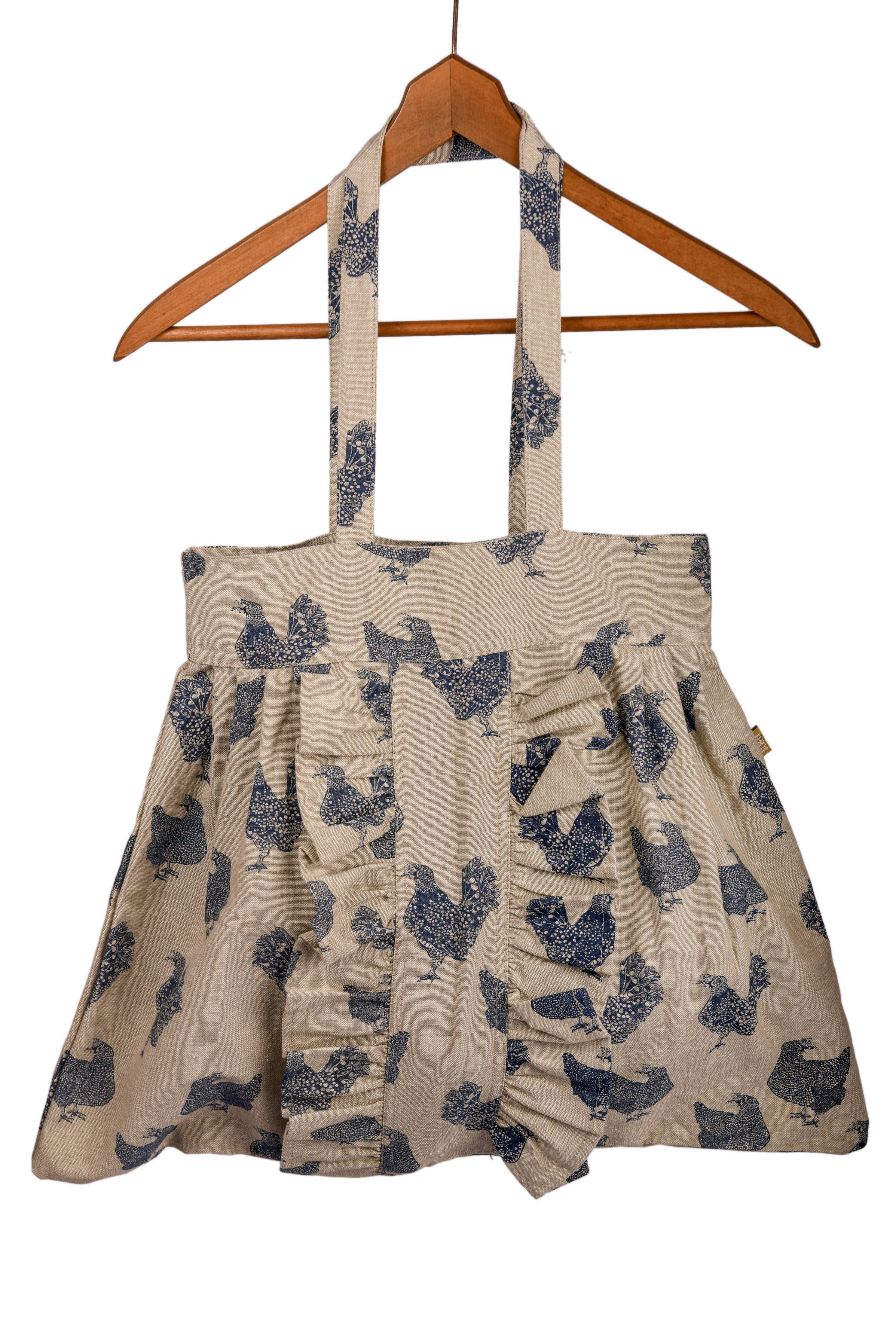 Add some urban country chic to shopping with this Blueberry colored Chicken pattern tote. The ruffled front adds some sophisticated fun to this tote. Made of100% sustainable, recycled cotton and other fibers. 17 x 21.5