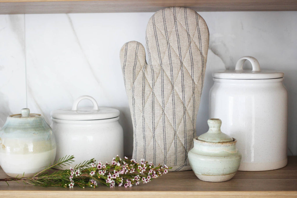 Quilted for extra protection from the heat, these oven gloves feature the Provincial stripe in Dark Slate. A hook tab makes it easy to hang this glove for storage and display. Made of 100% recycled cotton with natural dyes.