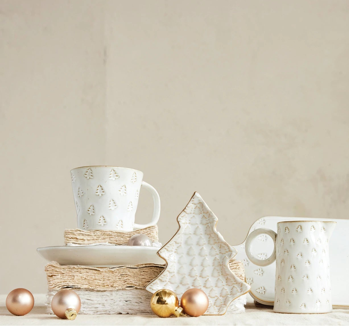 6"L x 5"W Stoneware Tree Shaped Plate w/ Trees & Gold Electroplating, Reactive Glaze, White (Each One Will Vary)