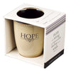 The back of the stoneware mug offers a definition of the word 'Hope,' tales from Scripture.