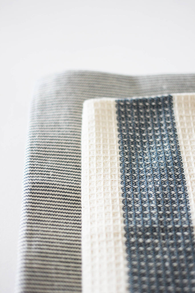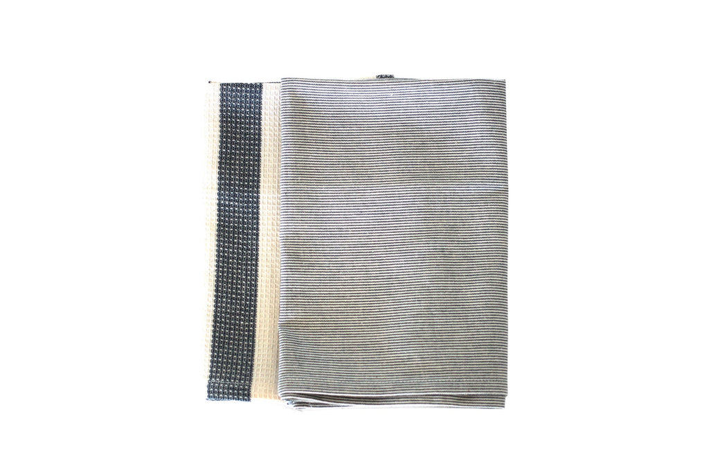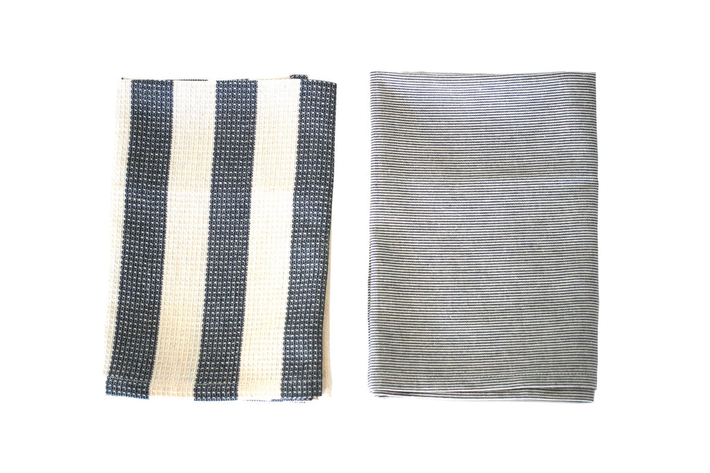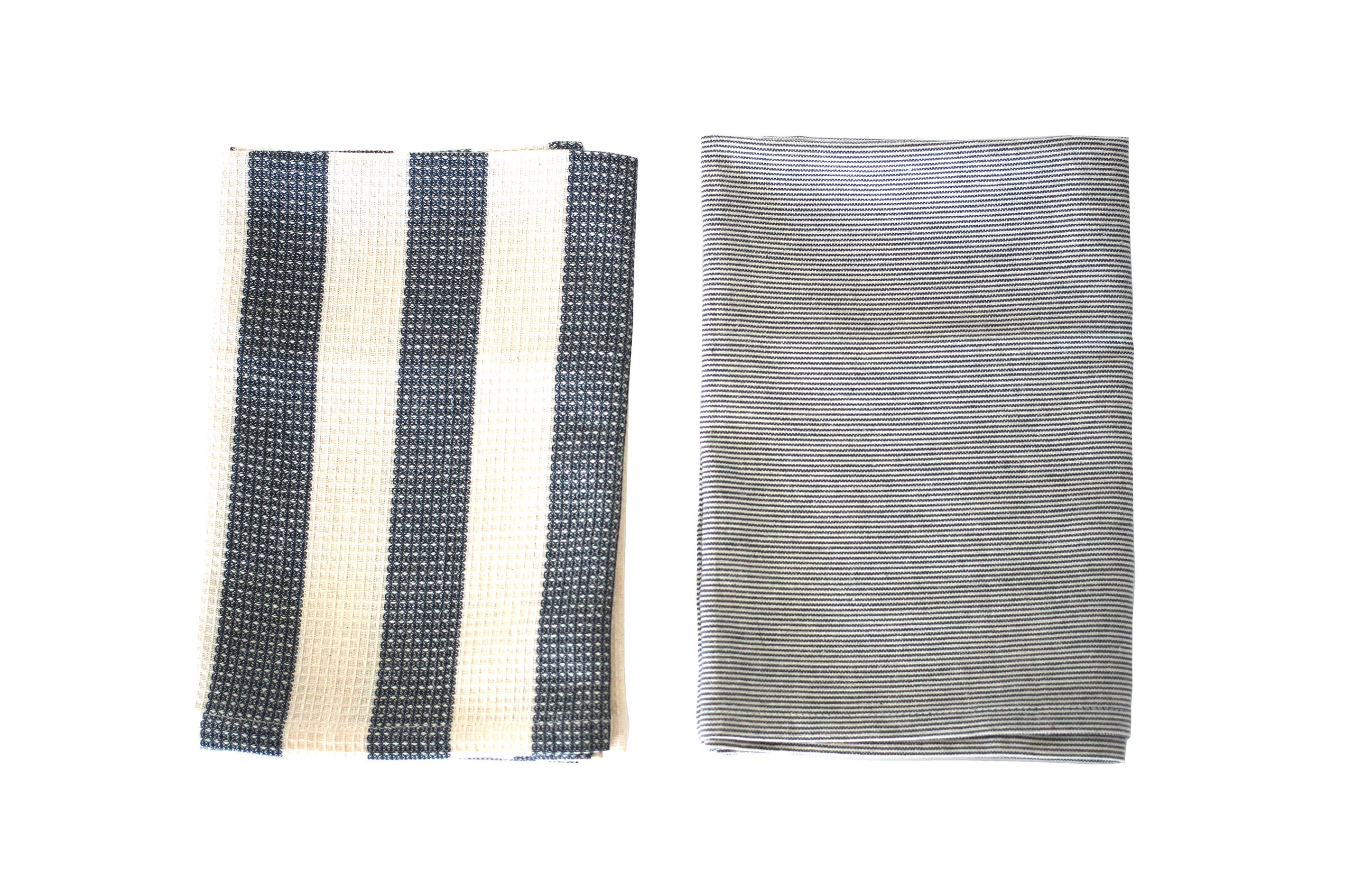 Two 100% recycled fabric tea towels. One in the wide horizontal stripe, the thin vertical stripe. Presented on recyclable cardboard cards for easy store display and gift giving. Four different colors available.