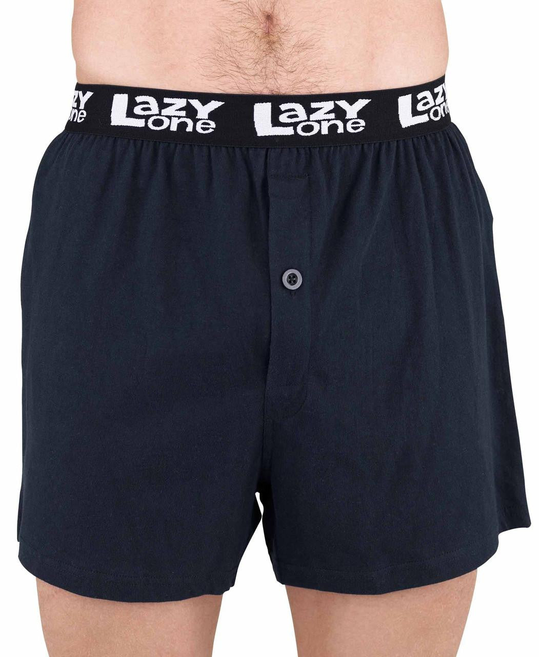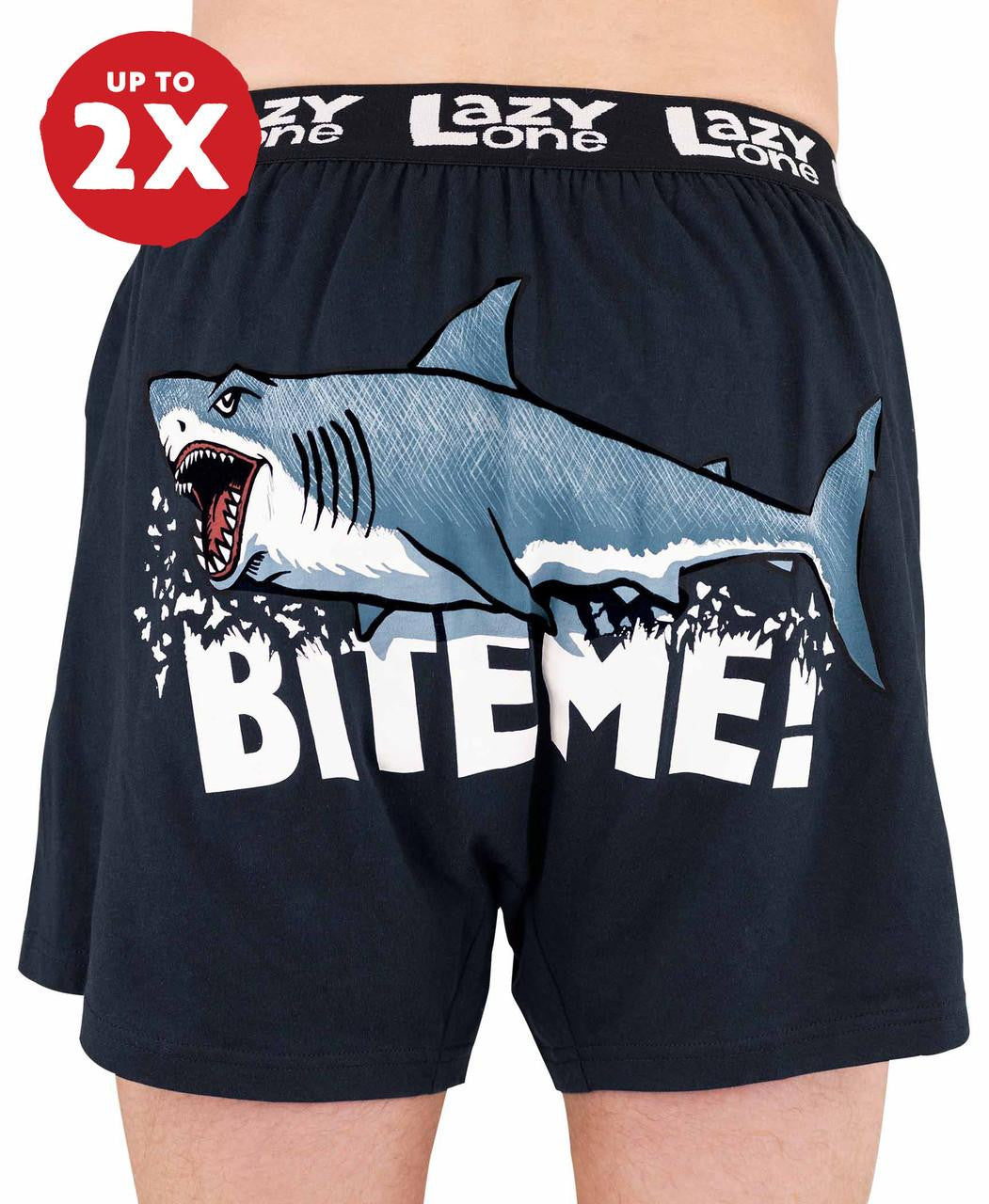 Make shark week every week with our Bite Me men's shark boxers. These boxers feature a fun great white shark design on the back of the dark blue boxers. Made from soft 100% combed cotton knit, our boxers have a roomy fit with a button fly and a plush-backed elastic band. It's easy to see why the butt stops here!
