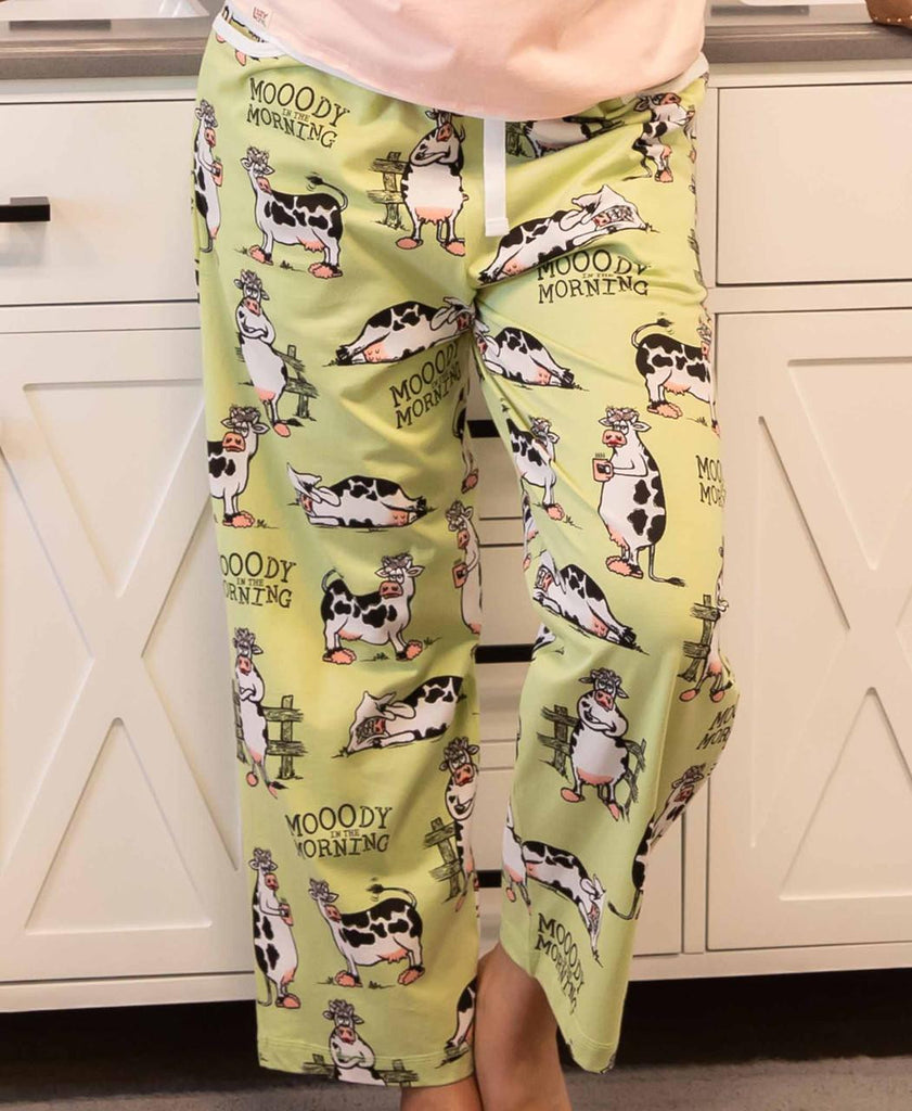Help yourself be in a better mood in the morning with our Moody in the Morning pajama pants. Made from breathable 100% combed cotton, these pants have two roomy side pockets and drawstring waist. These pajama pants feature a cute all over cow design any one would love. Matching tee can be purchased separately.