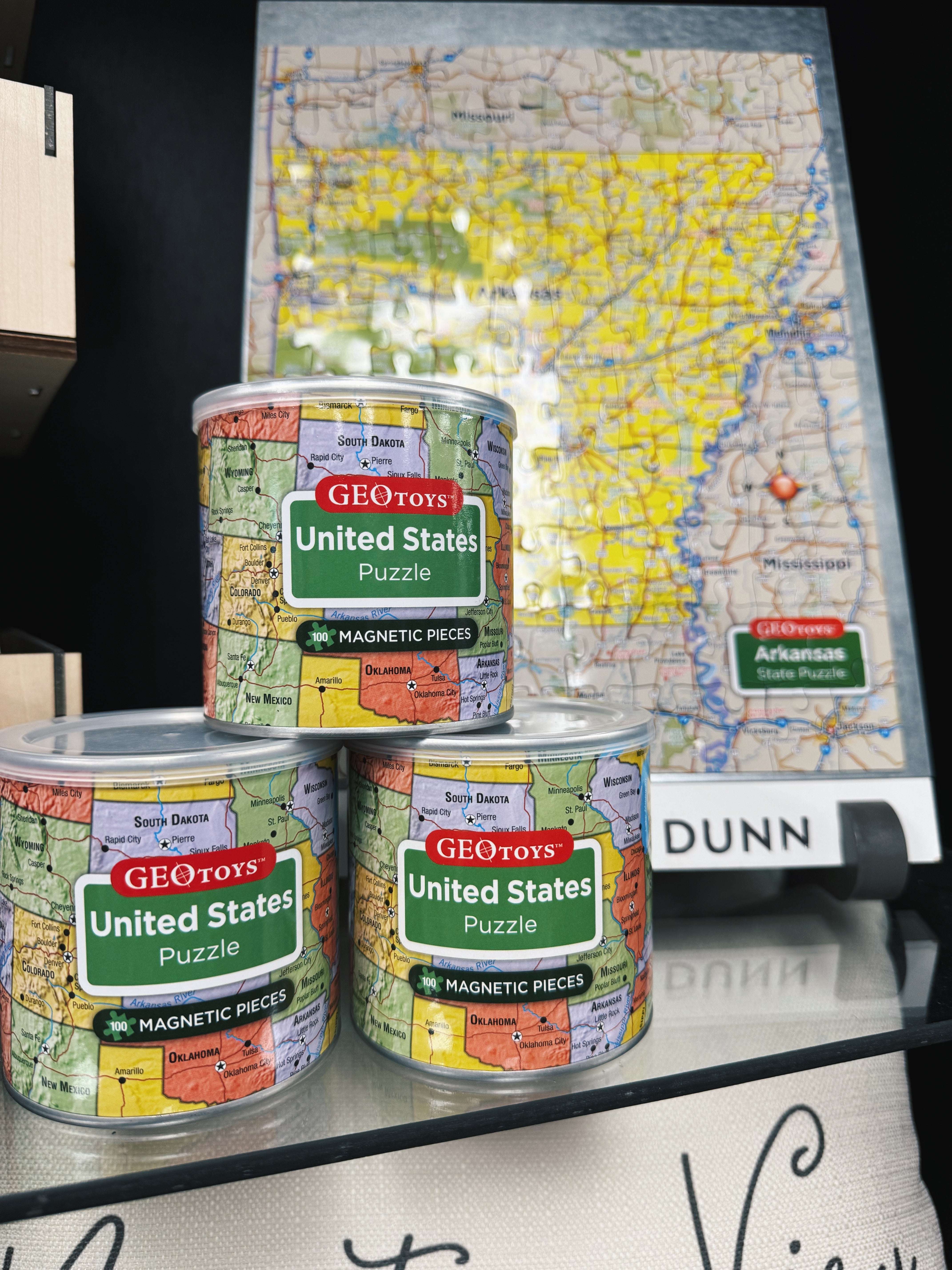 100-pc magnetic puzzles are jigsaw puzzles of cities and states. The puzzles, which have a magnetic backing, are packaged in small canisters. These fun puzzles can give you a whole new perspective on your favorite cities and states. Put them together on your table, or on your refrigerator, while you plan your next vacation. Puzzle size 13 x 10 inches, 100 pieces.